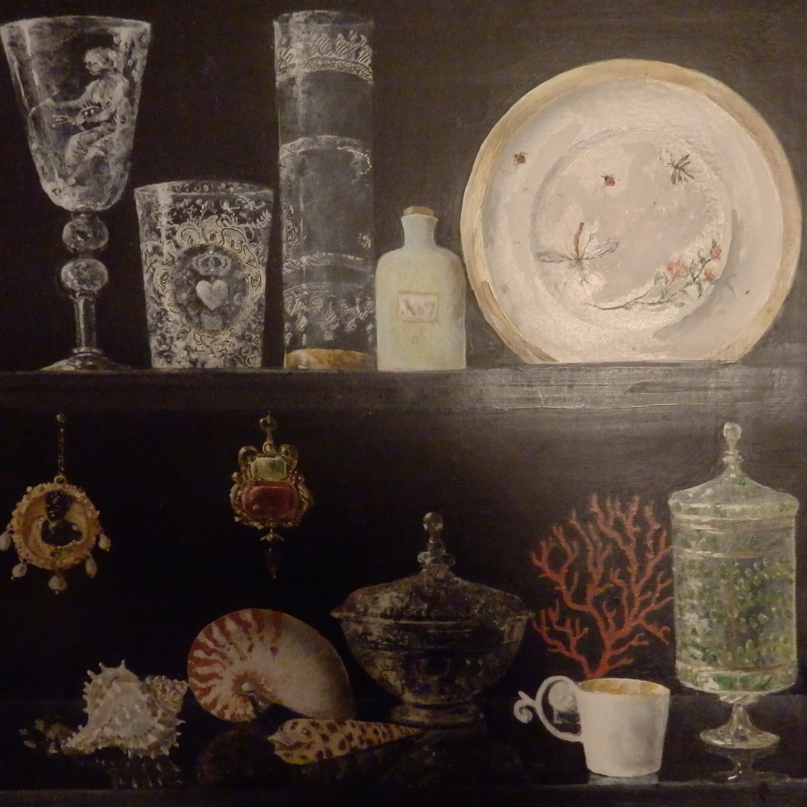 Ce grand cabinet de curiosités contient d'anciennes verreries vénitiennes, des perles, des coraux et coquillages, et les pots à pharmacie de mon grand'père, pharmacien, donc.